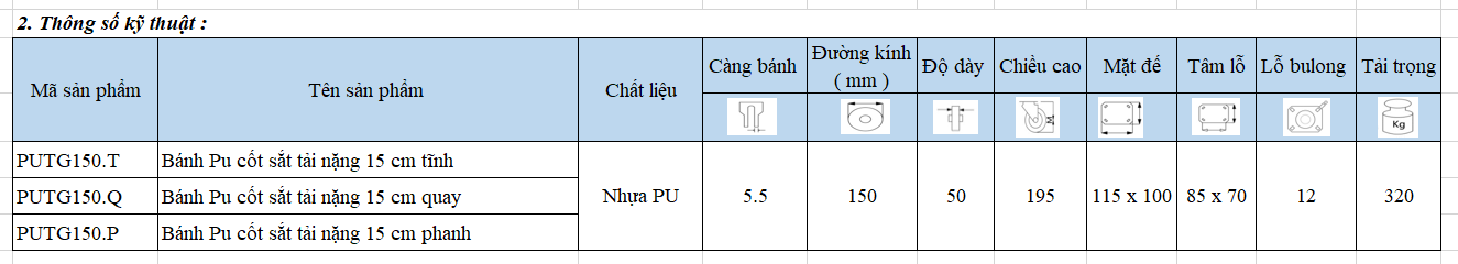 Đánh giá PUTG150.P : Bánh Pu cốt sắt tải nặng 15 cm phanh