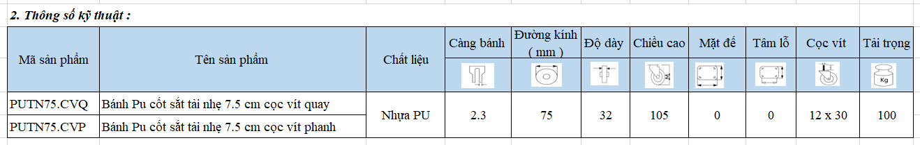 Đánh giá PUTN75.CVP : Bánh pu cốt sắt tải nhẹ 7.5 cm cọc vít phanh