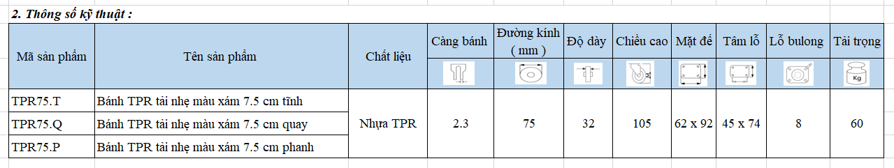Đánh giá TPR75.T : Bánh TPR tải nhẹ màu xám 7.5 cm tĩnh